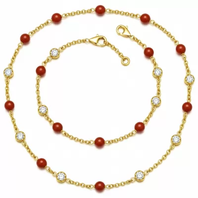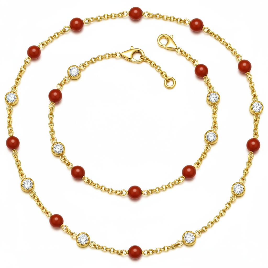 This exquisite beaded chain necklace seamlessly blends the warmth of 18KT yellow gold with the vibrant allure of richly colored red beads. The finely crafted chain features precisely interspersed natural red carnelian spheres, creating a captivating rhythm around the wearer's neck. Tiny, brilliant VVS diamond accents are meticulously set into the gold stations, adding subtle sparkle and defining the piece's high-jewelry status. It is a striking yet elegant design, perfect for layering or wearing as a standalone statement.