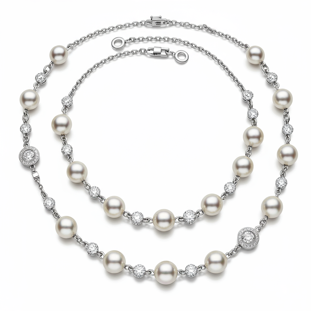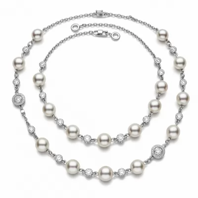 This stunning long pearl necklace set encapsulates classic elegance married with modern brilliance. Strands of perfectly uniform freshwater cultured pearls cascade gracefully, punctuated by stations adorned with brilliant-cut VVS diamonds. Crafted in lustrous 18KT white gold, this piece offers versatile styling, perfect for layering or wearing as a single, statement drape. It is an heirloom quality piece designed to capture light and attention at every turn.