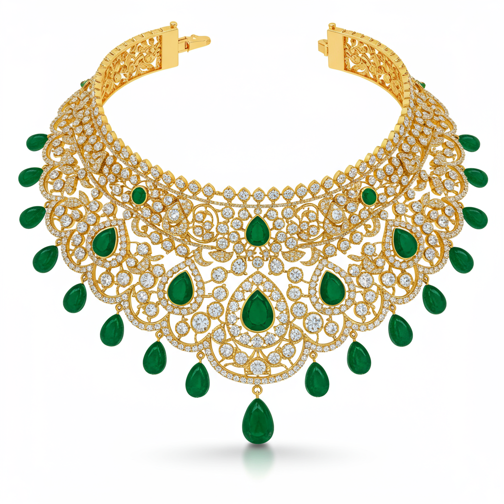 The Rajwadi Necklace is an embodiment of royal heritage, crafted meticulously in 18KT yellow gold. This elaborate collar piece features thousands of brilliant round diamonds meticulously set to maximize light return, complemented by stunning natural tear-drop emeralds. Its traditional design echoes the grandeur of ancient Indian jewelry, making it the perfect statement piece for bridal or high-society events. Experience unparalleled luxury and detailed craftsmanship in this extraordinary creation.