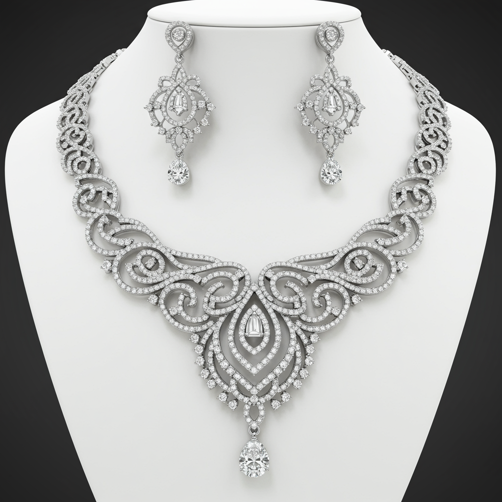 This stunning American Diamond Necklace Set captures the opulent grandeur of royal Indian jewelry. Crafted meticulously in gleaming 18KT white gold, the design features intricate filigree work and flowing patterns set with flawless, high-grade cubic zirconia stones. The elaborate centerpiece cascades elegantly, complemented by matching oversized drop earrings, making it the perfect statement piece for bridal or high-society events. This set delivers breathtaking brilliance and timeless sophistication designed to dazzle. It is a true heirloom piece offering unmatched value and beauty.