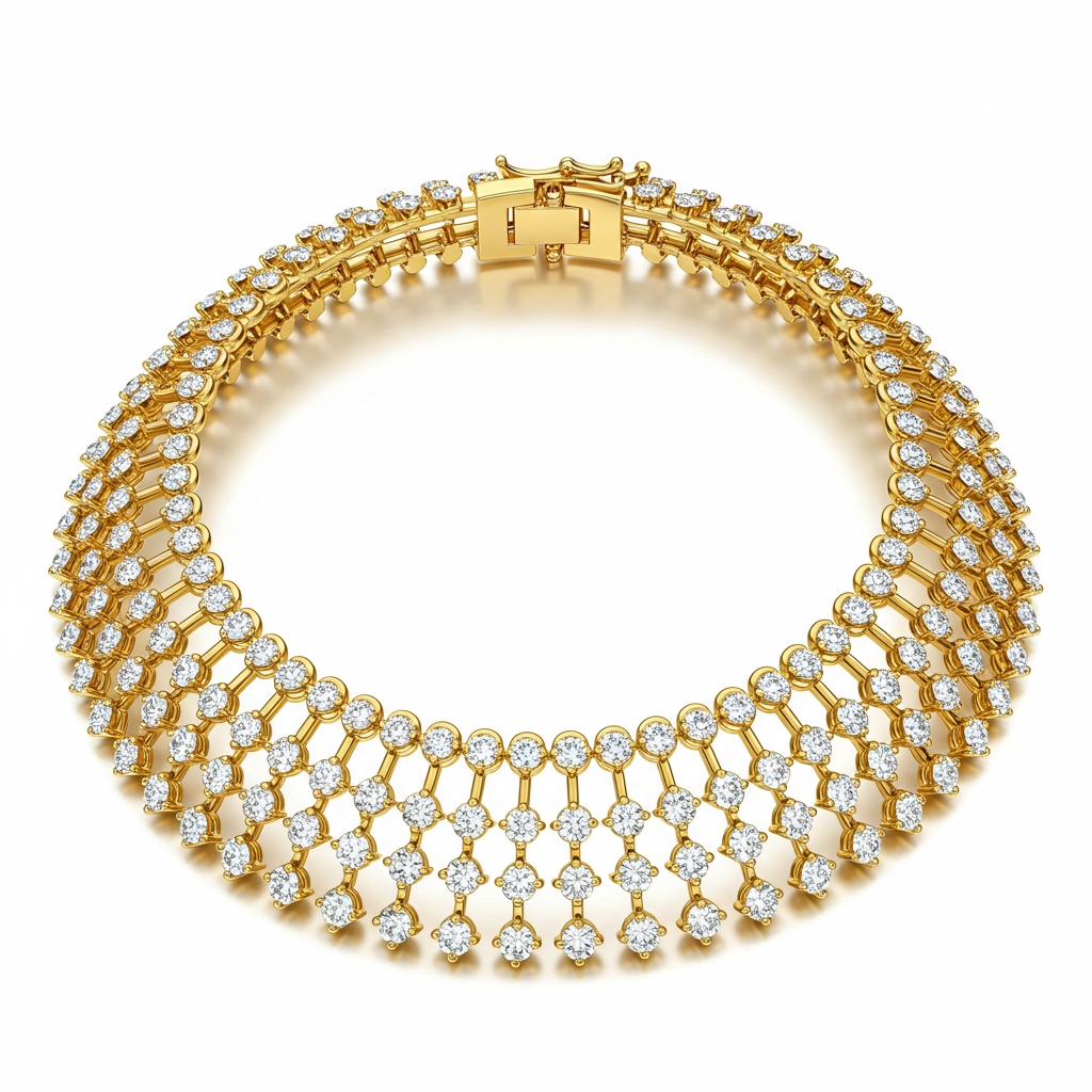 This exquisite gold plated choker necklace defines contemporary elegance, meticulously crafted to sit perfectly at the collarbone. It features a stunning arrangement of pavé-set VVS diamonds, creating an uninterrupted line of brilliant sparkle. The 18KT yellow gold base provides a substantial foundation, enhanced by a rich layer of gold plating for lasting luster. This piece transitions effortlessly from formal wear to elevated daily attire, making it an essential statement accessory.