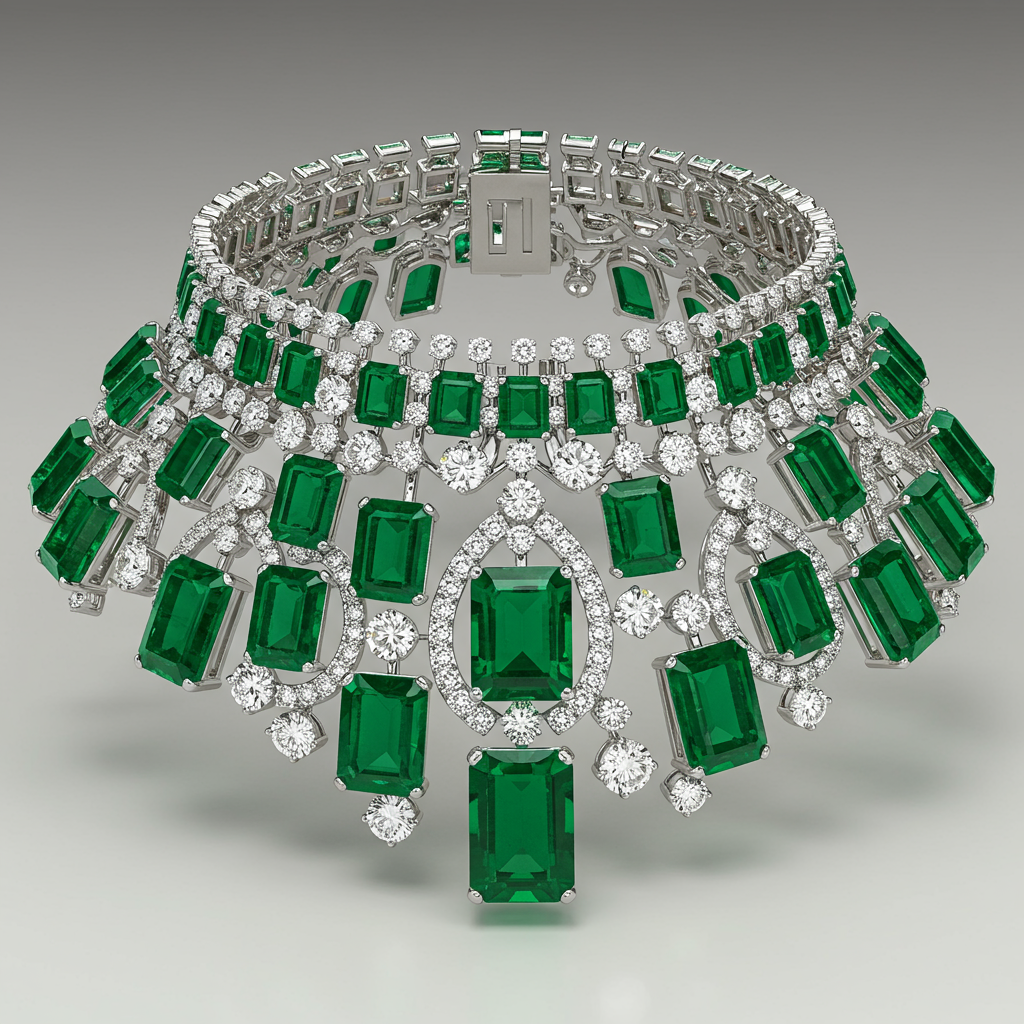 This exquisite green choker necklace is a masterpiece of high jewelry, crafted in lustrous 18KT white gold. It features a continuous line of vibrant, precision-cut emeralds, each perfectly framed by brilliant VVS diamonds. The articulated design ensures a flawless drape against the neckline, radiating opulence and sophistication. This statement piece captures light from every angle, making it an unforgettable accessory for the grandest occasions.