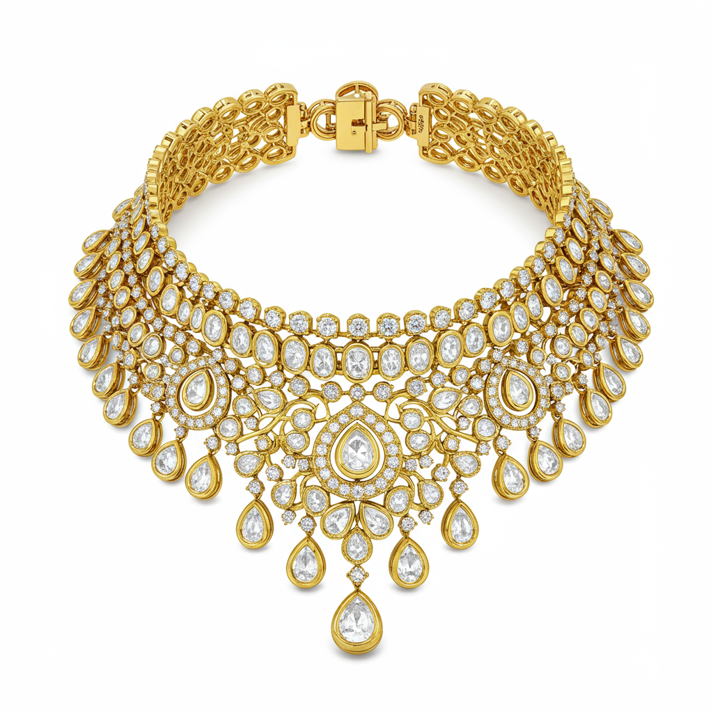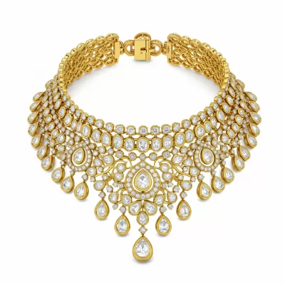 The Kundan Choker Necklace is a masterpiece of traditional Indian craftsmanship, seamlessly blending large uncut polki stones with brilliant diamond accents. Set in lustrous 18KT yellow gold, this dramatic piece features intricate filigree work framing each primary stone. It rests elegantly at the collarbone, providing a regal and show-stopping statement suitable for bridal wear or grand occasions. This heritage design captures the essence of royal splendor and timeless glamour.