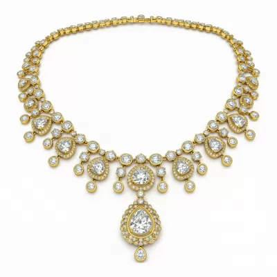 The Polki Heritage Necklace Set is a masterpiece of traditional Indian craftsmanship, designed for the modern bride. This exquisite set showcases luminous, uncut Polki diamonds set meticulously in high-polish 18KT yellow gold. Complementary brilliant-cut diamonds frame the polkis, enhancing their raw, majestic beauty. A breathtaking statement piece, this set radiates timeless elegance and regal splendor and includes matching drop earrings.