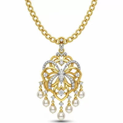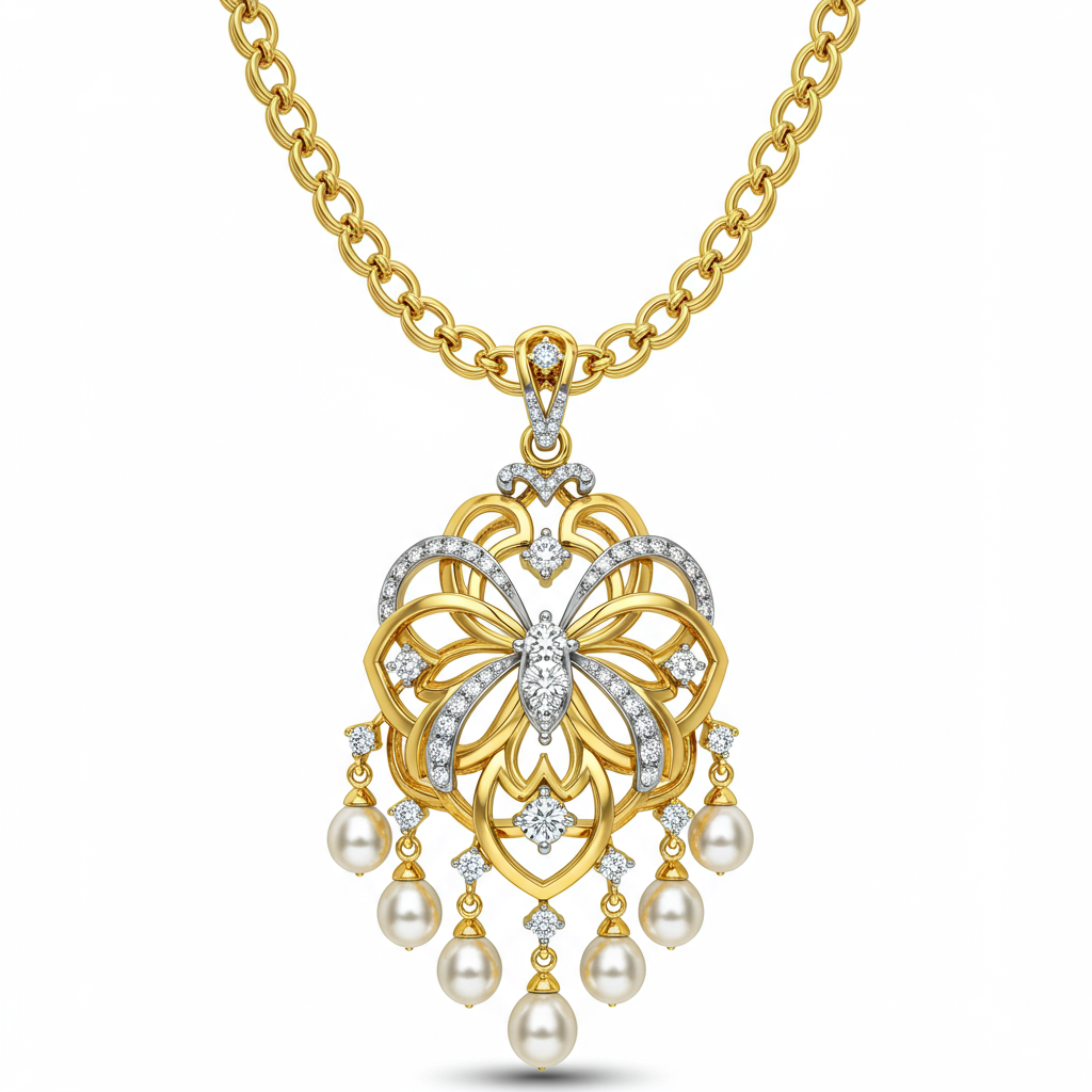 A majestic 22k yellow gold necklace set, designed to embody royal elegance and heritage. This traditional statement piece features cascading strings of brilliant, natural pearls leading to an ornate diamond-studded pendant and matching earrings. The intricate craftsmanship highlights the rich texture of high-purity gold, making this set a perfect heirloom for grand occasions. It pairs timeless style with unparalleled luxury and is ideal for bridal wear.