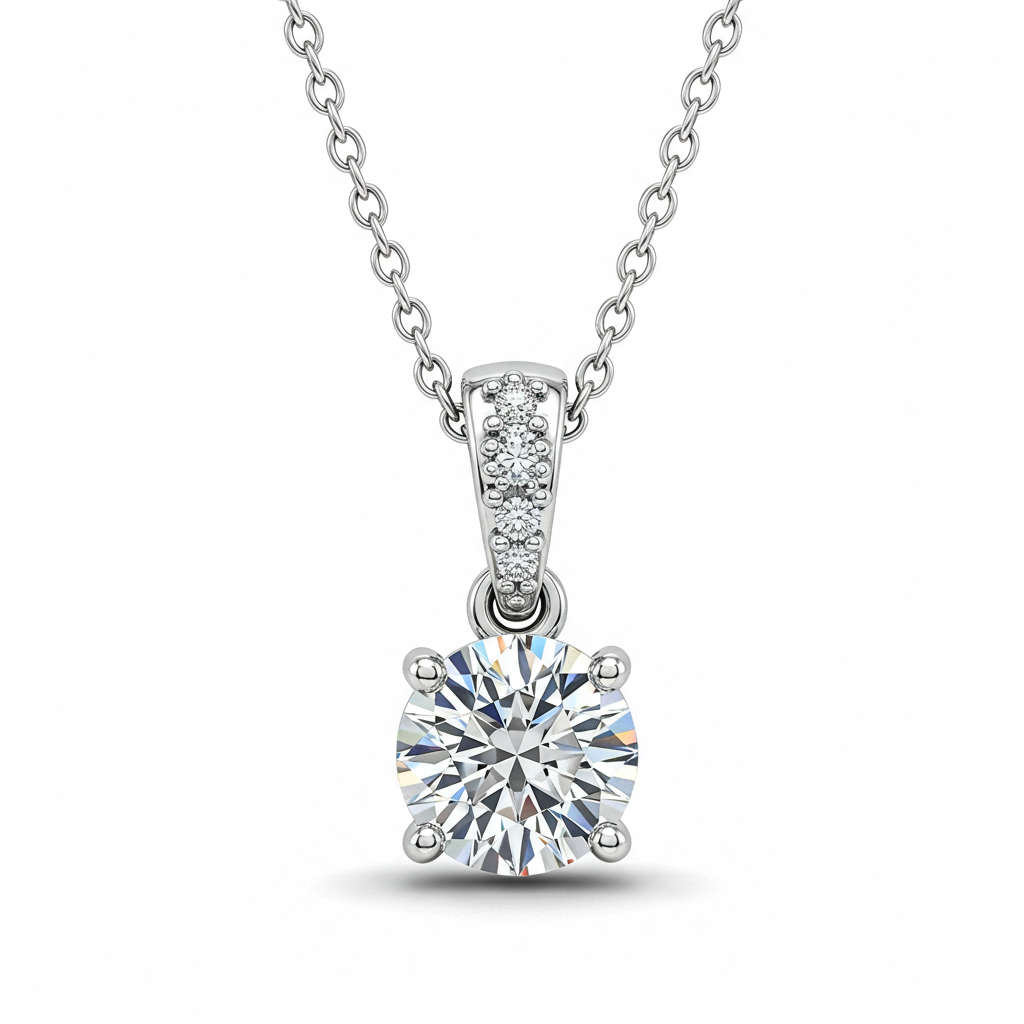 The Ad Diamond Necklace captures timeless elegance in a refined, minimalist design, centered around a spectacular round brilliant diamond. Meticulously set in lustrous 18KT white gold, the flawless VVS centerpiece is complemented by delicate pave accents on the bail. This exquisite piece is designed to lie perfectly along the collarbone, reflecting maximum light with every sophisticated movement. It serves as the ultimate statement of luxury, suitable for both everyday refinement and grand evening events.