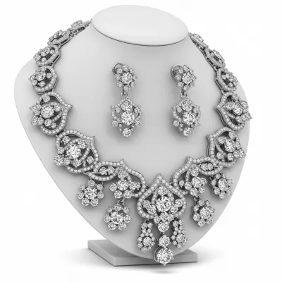 The AD Necklace Set epitomizes timeless glamour and exquisite craftsmanship, designed for those who demand maximum brilliance. Featuring a dynamic arrangement of VVS and VS quality round brilliant diamonds, this comprehensive set captures and reflects light from every angle, creating a spectacular shimmer. Crafted in radiant 18KT white gold, the intricate design blends classic high-volume clusters with modern fluidity. The coordinated necklace and earring ensemble ensures a perfectly matched look of breathtaking sophistication, making it the ultimate statement piece for grand occasions.