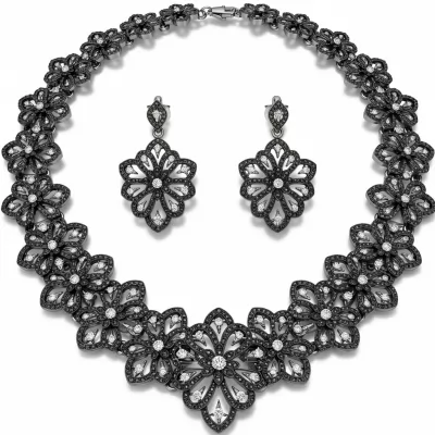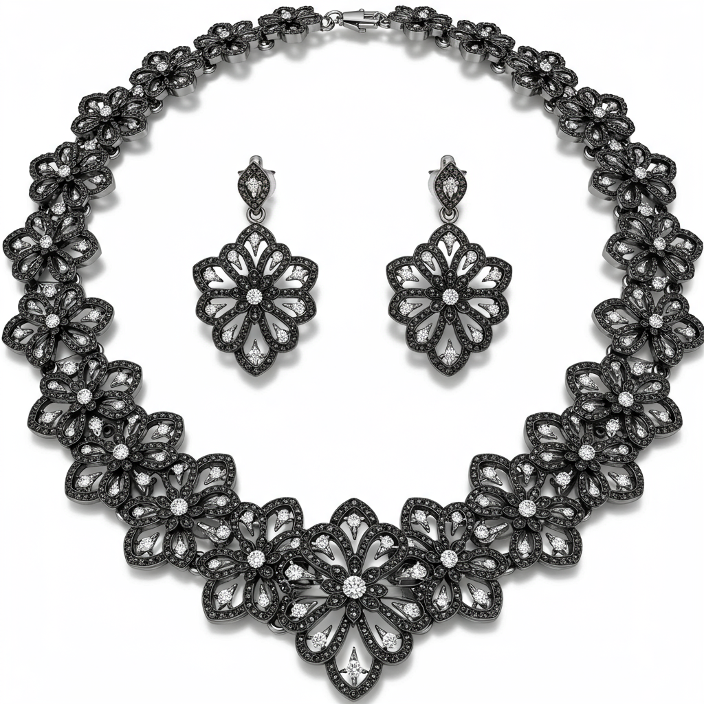 This exquisite oxidized necklace set captures the timeless grandeur of traditional Indian craftsmanship. Featuring intricate filigree work and deep, antique blackening, the design highlights detailed floral motifs embedded with sparkling micropavé diamonds. The ensemble includes a commanding statement necklace and perfectly matched drop earrings, offering a distinctive, bohemian luxury look. Crafted in 925 sterling silver, this set is a perfect blend of rustic charm and refined elegance, suitable for any major festive occasion.