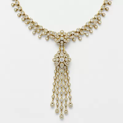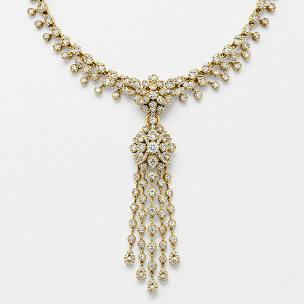 The Khazana Necklace is a masterpiece of articulated luxury, featuring cascading tiers of brilliant diamonds set in rich 18KT gold. This design captures the opulence of traditional high-end jewellery while maintaining a sophisticated modern flow. The central cluster acts as an anchor for the stunning diamond tassels that move gracefully with the wearer. It is an exceptional statement piece destined for the most glamorous events and formal gatherings.