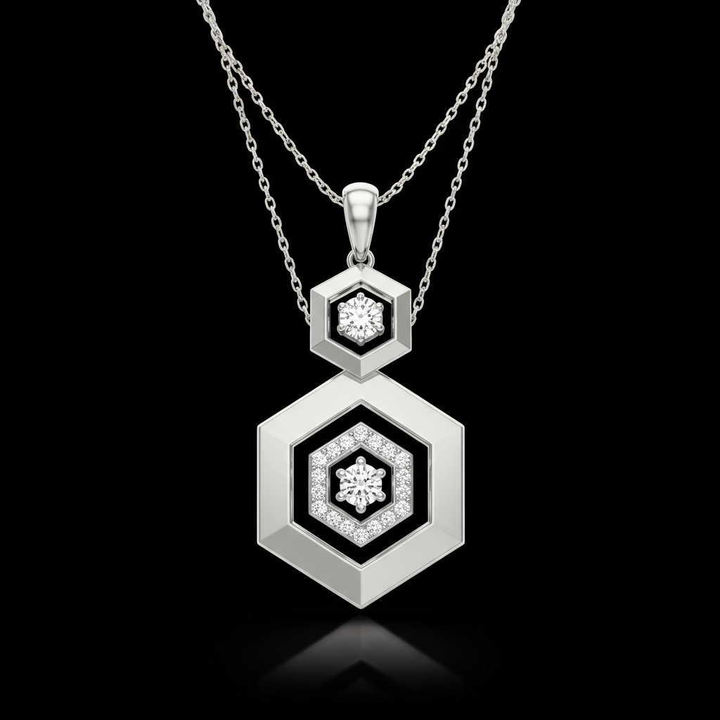 The Silver Necklace Design embodies modern sophistication through geometric simplicity. Crafted in lustrous 18KT white gold, the pendant features layered, interlocking elements creating a striking dimensional effect. This elegant piece is meticulously paved with brilliant VVS diamonds, catching the light with every movement. It offers versatile wearability, perfect for elevating both daily attire and evening ensembles.