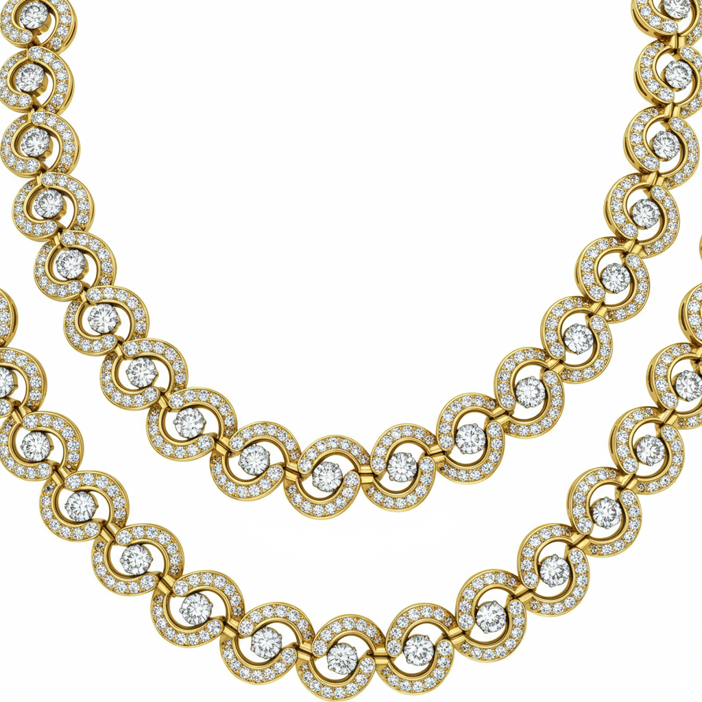 The Khazana Necklace is a masterpiece of articulating luxury, embodying regal opulence through contemporary design. This 18KT yellow gold piece features dynamic clusters of brilliant VVS diamonds, creating an unbroken stream of light that drapes elegantly around the neck. The sophisticated link structure allows the necklace to move fluidly, catching light from every angle, ensuring a stunning and unforgettable presence. It is a true treasure designed for the most discerning collector.