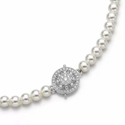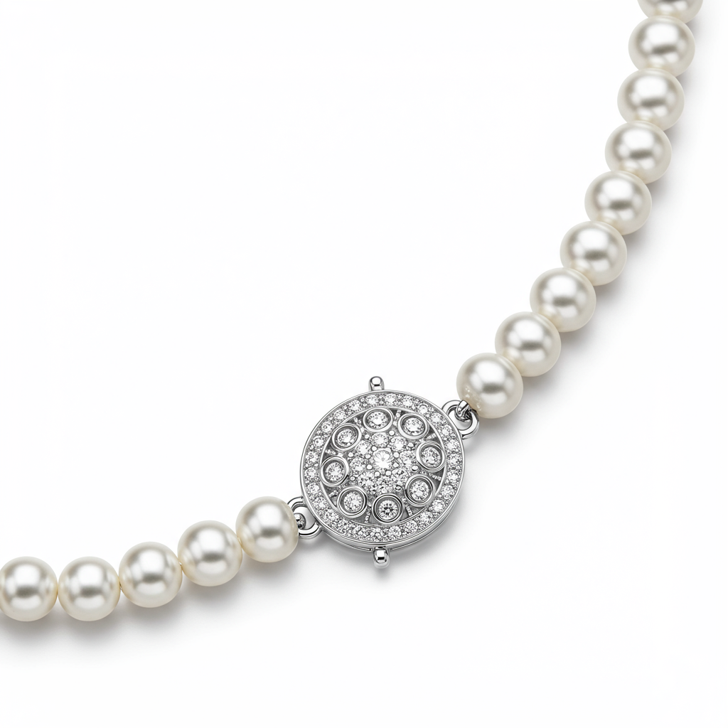 This exquisite silver pearl necklace features a continuous strand of lustrous, perfectly matched cultured pearls, renowned for their deep iridescence and flawless surfaces. Secured by a finely crafted 925 Sterling Silver clasp, accented with six brilliant-cut VVS diamonds, this piece radiates classic elegance. Its timeless design transitions seamlessly from sophisticated daywear to glamorous evening attire. A true heirloom piece designed for enduring beauty and grace.