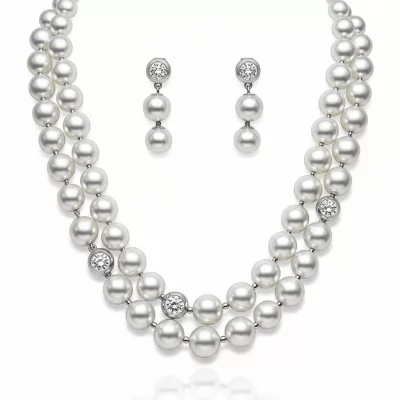 This exquisite White Pearl Necklace Set defines sophisticated glamour, showcasing flawless Akoya pearls complemented by brilliant diamond accents. Crafted meticulously in 18KT white gold, the design features a delicate drop motif perfect for formal occasions. The matching set offers effortless coordination, ensuring a radiant and timeless presence. This jewelry masterpiece is an heirloom piece destined to be cherished for generations.