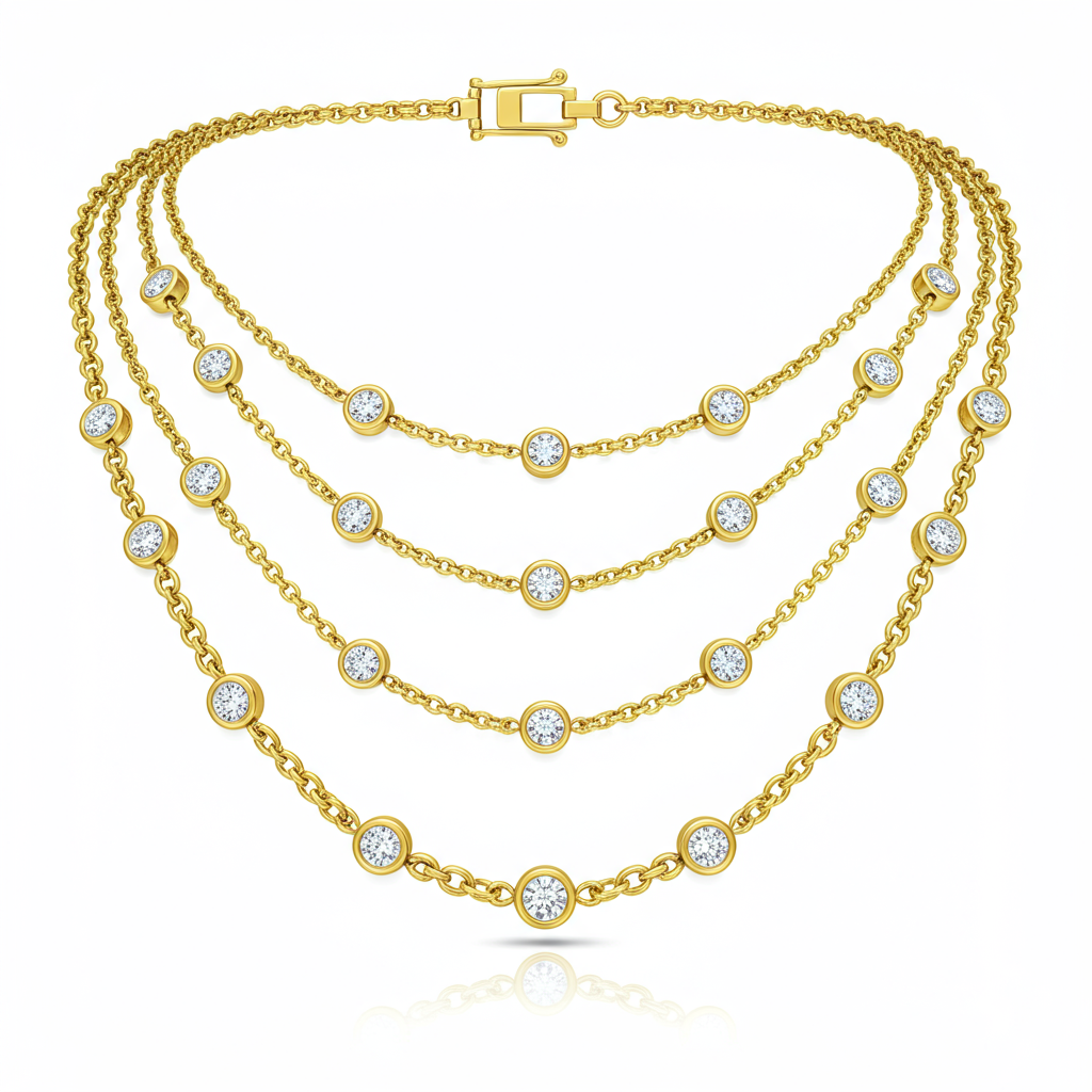 This exquisite layered necklace set features two distinct yet complementary chains crafted in radiant 18KT yellow gold. The first layer showcases a perfect bezel-set VVS round diamond, while the second presents a delicate station of shimmering pave diamonds. Designed for effortless elegance, this set offers a contemporary look of curated luxury. It is the definitive statement piece for sophisticated daily wear or evening glamour.
