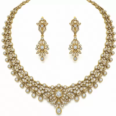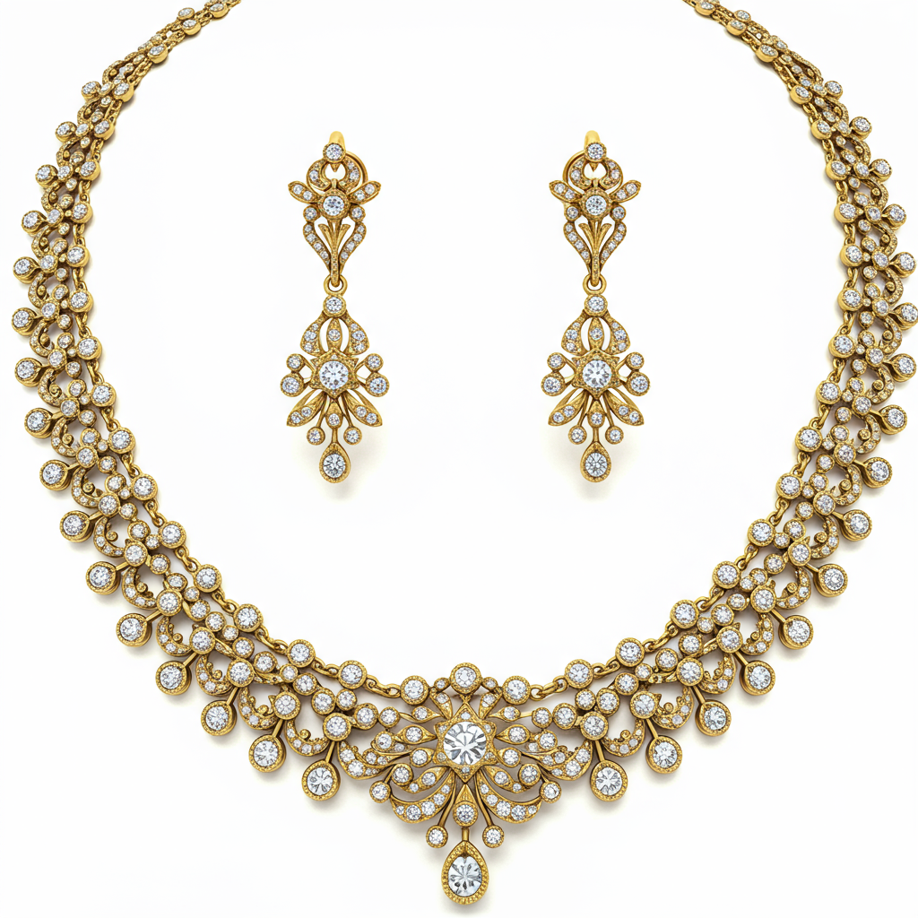 This magnificent antique necklace set embodies timeless grandeur, featuring intricate filigree work characteristic of vintage European design. Set in lustrous 18KT yellow gold, the design utilizes cascading floral motifs studded with brilliant-cut diamonds. The accompanying drop earrings perfectly mirror the central pendant, creating a harmonious and breathtaking ensemble. This heritage piece is an unparalleled statement of opulence, perfect for grand occasions.