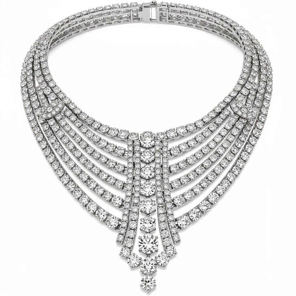 This exquisite party wear necklace is the epitome of glamour, designed to capture every eye in the room. Crafted from gleaming 18KT white gold, the fluid structure drapes elegantly along the neckline. It features intricate articulation and is fully embellished with hundreds of precisely set, brilliant-cut diamonds. This statement piece promises incomparable sparkle, making it essential for any grand occasion or celebratory event.