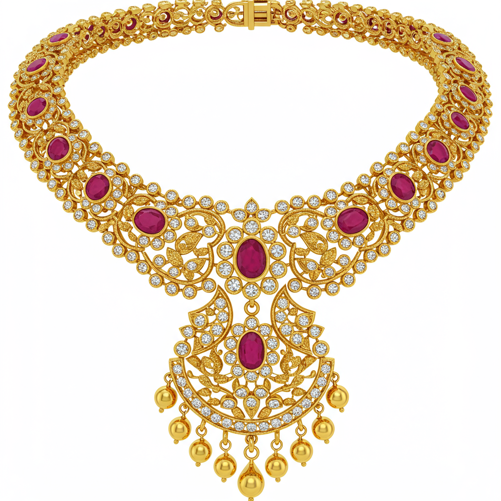 The Temple Design Necklace is an exquisite tribute to traditional Indian craftsmanship, intricately detailed in radiant 18KT yellow gold. This statement piece features complex sculptural motifs reminiscent of ancient temple architecture, symbolizing divinity and grace. It is lavishly adorned with brilliant VVS diamonds, meticulously set to enhance the antique texture and elaborate framework. This magnificent necklace is a heritage treasure, perfect for grand ceremonial occasions, offering both depth and sparkle.