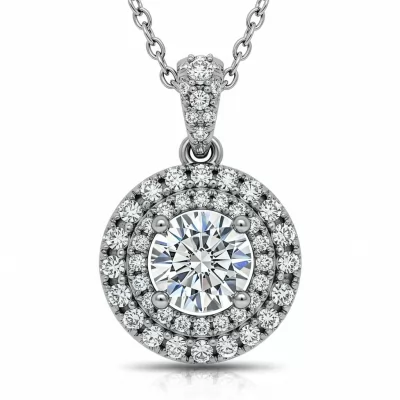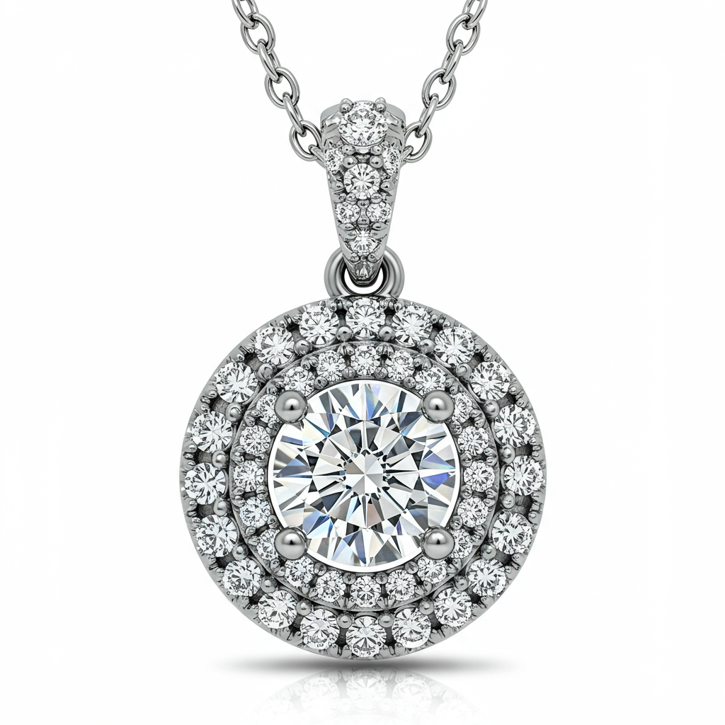 The Dream Lover Necklace captures eternal devotion with its breathtaking diamond halo design. Featuring a brilliant VVS diamond centerpiece, the setting is meticulously encircled by smaller accent stones that enhance its mesmerizing radiance. Crafted in luminous 18KT white gold, this sophisticated silhouette rests elegantly on the décolletage. It is the perfect symbol of a cherished, unforgettable romance, designed for enduring luxury.