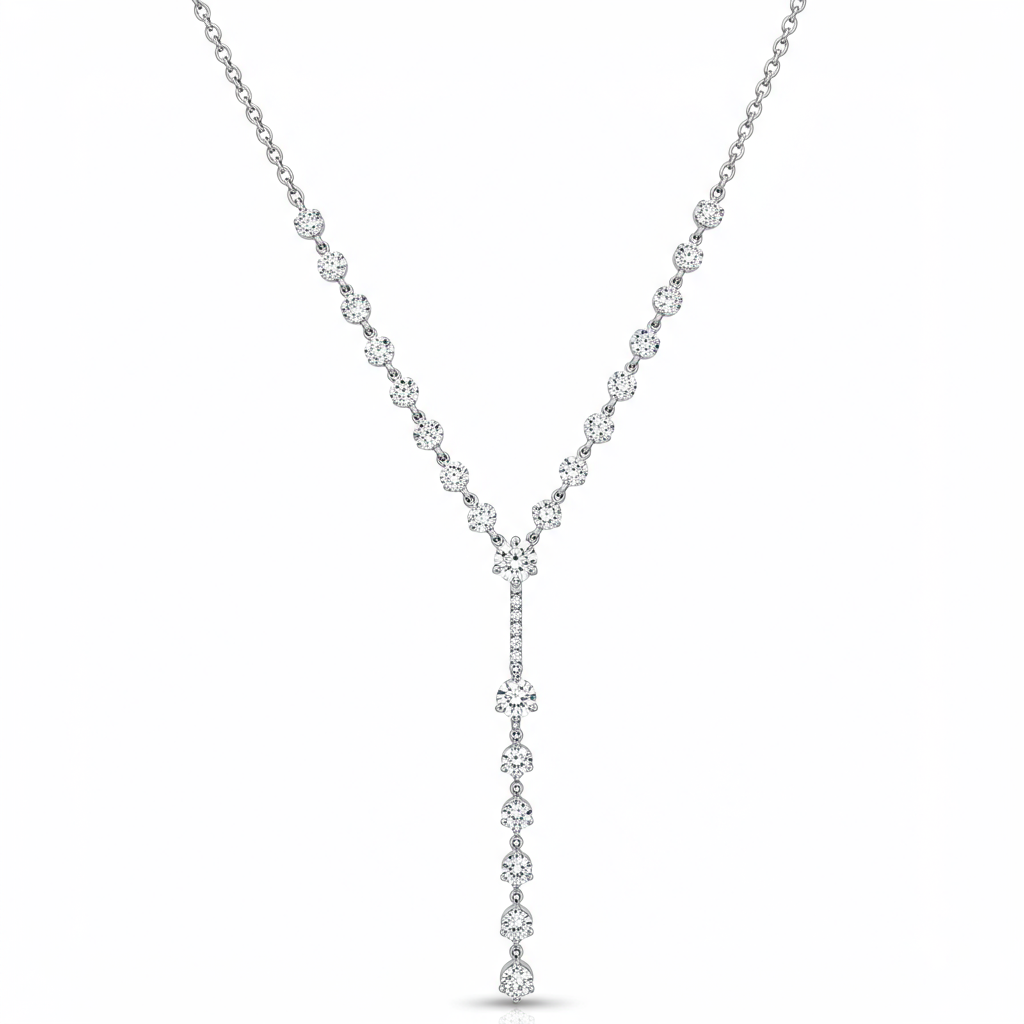 This exquisite long necklace embodies effortless luxury, featuring a gracefully extended chain crafted in luminous 18KT white gold. It showcases brilliant VVS round diamonds meticulously set along the drop, creating a captivating stream of light. Designed to elongate the silhouette, this versatile piece transitions seamlessly from sophisticated daywear to glamorous evening attire. It is the definitive statement of modern elegance and enduring style.