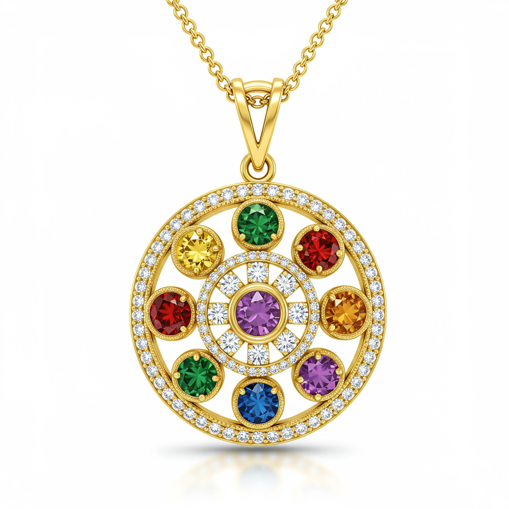 The Navaratna Necklace is a majestic tribute to celestial splendor, meticulously crafted in 18KT yellow gold. This traditional masterpiece showcases the nine astrological gemstones, each carefully selected to represent a planetary deity. Surrounded by a brilliant pave halo of VVS diamonds, the central arrangement radiates profound protective energy and timeless elegance. Worn close to the heart, this necklace serves as both a dazzling adornment and a powerful talisman of good fortune.