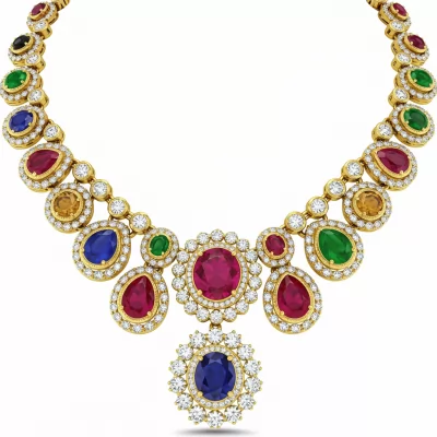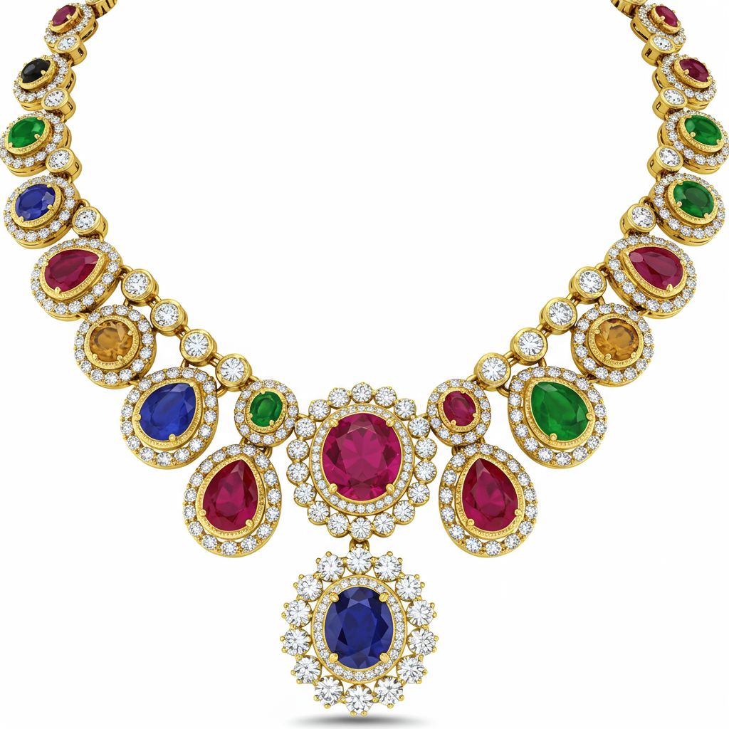 A majestic 18KT yellow gold navratna necklace, exquisitely crafted to honor the nine celestial deities. This traditional design features nine carefully selected, high-quality gemstones, each representing a planetary influence, beautifully offset by brilliant VVS round diamonds. The luxurious cluster setting and intricate metalwork create an aura of divine elegance. This powerful piece serves as a statement heirloom, perfect for sacred occasions or grand celebrations.