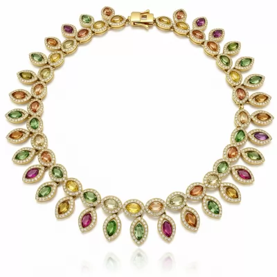 The Palakka Necklace captures the essence of South Indian heritage through intricate artistry and vibrant detailing. Crafted in luxurious 18KT Yellow Gold, this heirloom piece features a series of traditional leaf-shaped settings, meticulously embedded with brilliant green color stones. These colorful elements are exquisitely framed by pavé-set VVS G-color diamonds, providing a sophisticated contrast and stunning sparkle. This statement necklace is a timeless masterpiece, perfect for weddings and grand cultural celebrations, embodying both tradition and high luxury.