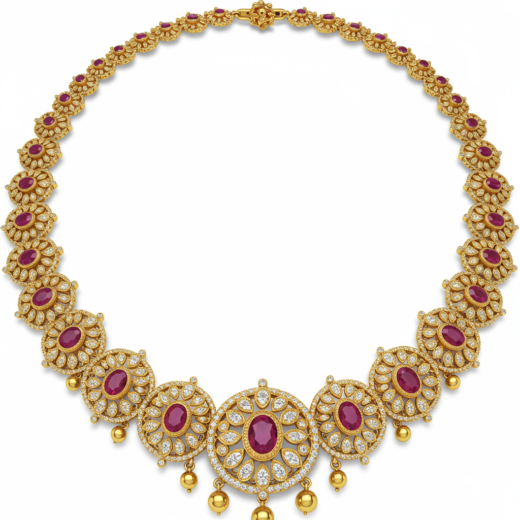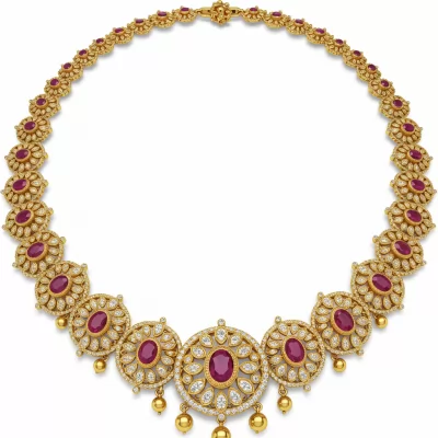 The South Indian Gold Necklace is a magnificent tribute to traditional temple jewelry craftsmanship. Sculpted in lustrous 18KT yellow gold, this piece features intricate detailing reminiscent of classical heritage designs. It is richly adorned with carefully set VVS diamonds and vibrant rubies, capturing the opulent spirit of South Indian artistry. This breathtaking necklace serves as a luxurious centerpiece for any ceremonial occasion.