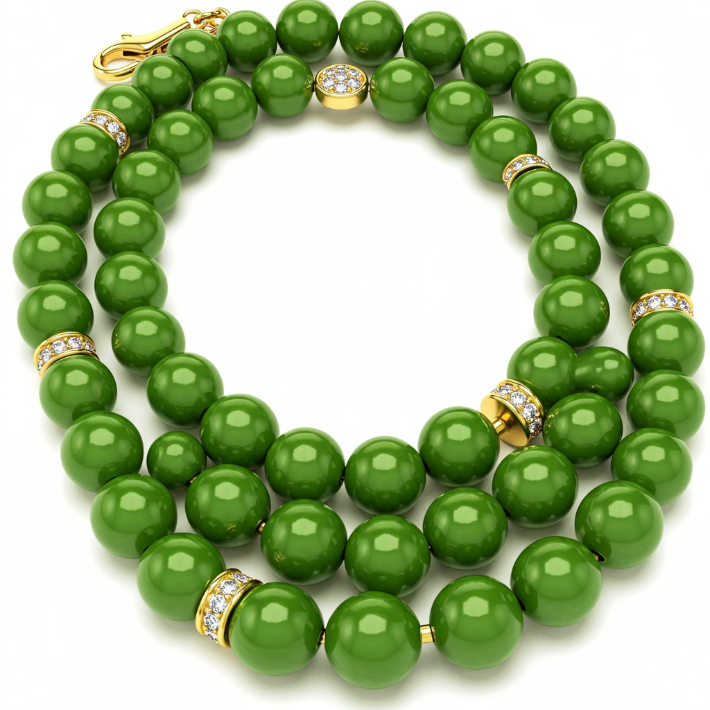 This exquisite green beads necklace features perfectly uniform, highly polished green gemstone spheres strung along a delicate 18KT yellow gold chain. Interspersed throughout the strand are brilliant-cut diamond accents, adding subtle sparkle and defining the luxurious drape of the piece. The vibrant emerald hue of the beads creates a bold statement, perfect for high-fashion evening wear or sophisticated daytime elegance. Finished with a secure, custom-designed clasp, this piece is an essential heirloom investment.