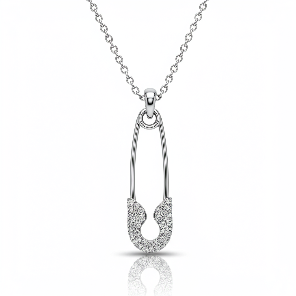 The Safety Pin Necklace is a masterpiece of modern symbolism, capturing the spirit of protection and connection in radiant 18KT white gold. This minimalist pendant design is meticulously micro-pave set with brilliant VVS diamonds, creating a continuous line of sparkle along its curve. It offers a subtle yet profound statement piece, balancing edgy aesthetic with timeless elegance. Worn close to the heart, this necklace serves as a luxurious reminder of solidarity and personal strength.