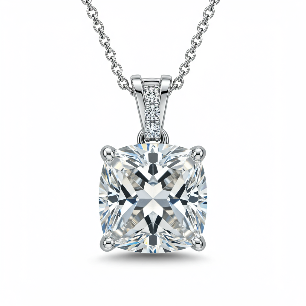 This exquisite silver stone necklace features a brilliant cushion-cut solitaire setting, designed to maximize light return and sparkle. Crafted from luminous 925 Sterling Silver, the central stone is securely held by intricate prongs, ensuring exceptional visibility and brilliance. Small, high-clarity diamond accents adorn the bail, adding a refined touch of luxury. The design embodies minimalist elegance, making it a timeless piece perfect for daily wear or sophisticated occasions.