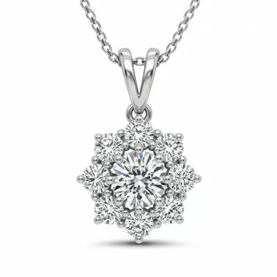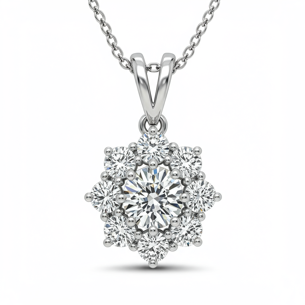 This exquisite pendant necklace encapsulates timeless luxury, designed in flawless 18KT white gold. It features a stunning central diamond surrounded by a brilliant cluster halo, maximizing light reflection and visual impact. The meticulous setting showcases approximately 1.20 carats of VVS diamonds, delivering exceptional sparkle and fire. Suspended from a delicate yet durable chain, this piece is the ultimate statement of sophisticated elegance and craftsmanship.