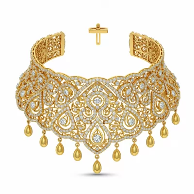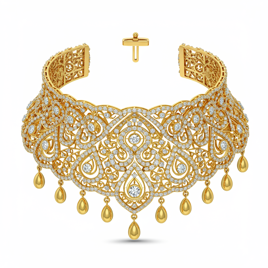 This masterpiece is a traditional choker necklace, meticulously crafted in radiant 18KT yellow gold. It embodies classic heritage design, featuring intricate filigree work and detailed carving typical of royal Indian jewelry. The structure is generously set with brilliant-cut diamonds, creating a cascade of light and unparalleled sparkle across the neckline. This substantial piece is designed to be a timeless heirloom, perfect for grand wedding occasions and ceremonial events.