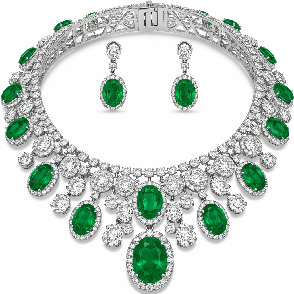 This exquisite emerald and diamond necklace set defines timeless elegance and high sophistication. Crafted in luxurious 18KT white gold, the set features magnificent natural emeralds as the focal point, framed by brilliant VVS clarity round diamonds. The intricate articulation ensures a perfect drape around the neck, highlighting the vibrant green hues against the dazzling white sparkle. This comprehensive set is an ultimate statement piece for gala events and grand occasions.