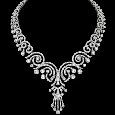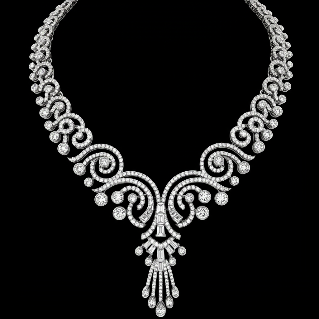 This exquisite long necklace set epitomizes grandeur and timeless elegance, designed to drape gracefully and capture every light source. Crafted in lustrous 18KT white gold, the design features a continuous stream of finely set VVS clarity diamonds, creating a mesmerizing, fluid sparkle. The meticulous articulation ensures comfort and movement, enhancing the luxurious feel of the piece. The accompanying components complete the ensemble, ensuring a cohesive and breathtaking presentation, making this set a true heirloom.