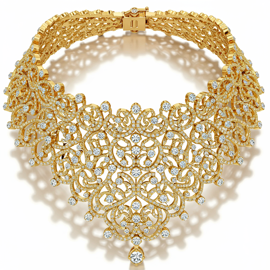 The Rani Necklace is a masterpiece of regal design, capturing the splendor of traditional Indian jewelry translated through meticulous modern techniques. Crafted in rich 18KT yellow gold, this wide collar necklace features an intricate filigree structure entirely studded with brilliant-cut diamonds. Its fluid articulation ensures it drapes elegantly around the neck, offering unparalleled luxury and making a magnificent statement at any grand occasion. This exceptional piece epitomizes heirloom quality and timeless sophistication.