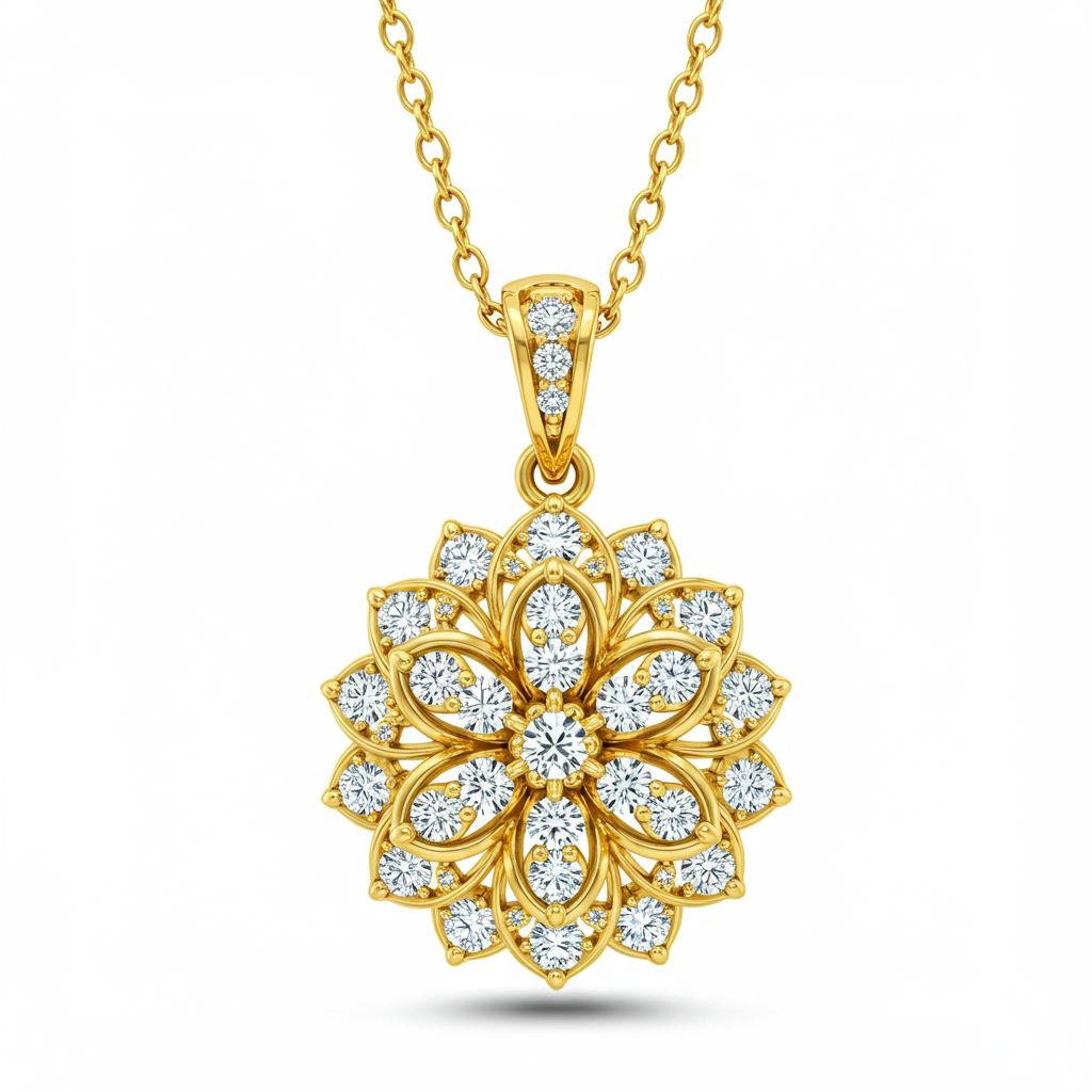 The Floral Gold Necklace captures the timeless elegance of nature, crafted entirely in luminous 18KT yellow gold. This exquisite piece features a delicately articulated floral motif, symbolizing growth and perpetual beauty. Each petal is meticulously set with brilliant VVS diamonds, creating a continuous halo of light. Suspended from a refined gold chain, this necklace is an heirloom-quality treasure perfect for celebrating life's most cherished moments. Its sophisticated design transitions seamlessly from daytime elegance to evening glamour.