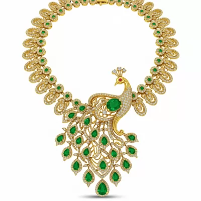 The Peacock Majesty Necklace is a magnificent tribute to traditional Indian artistry, rendered in radiant 18KT yellow gold. The intricately detailed peacock motif is adorned with brilliant pave-set diamonds, capturing the bird's graceful plumage. Large, vibrant emeralds form the central body, lending a striking contrast and luxurious depth. This piece is designed to be a timeless heirloom, perfect for grand occasions and celebrating cultural heritage.