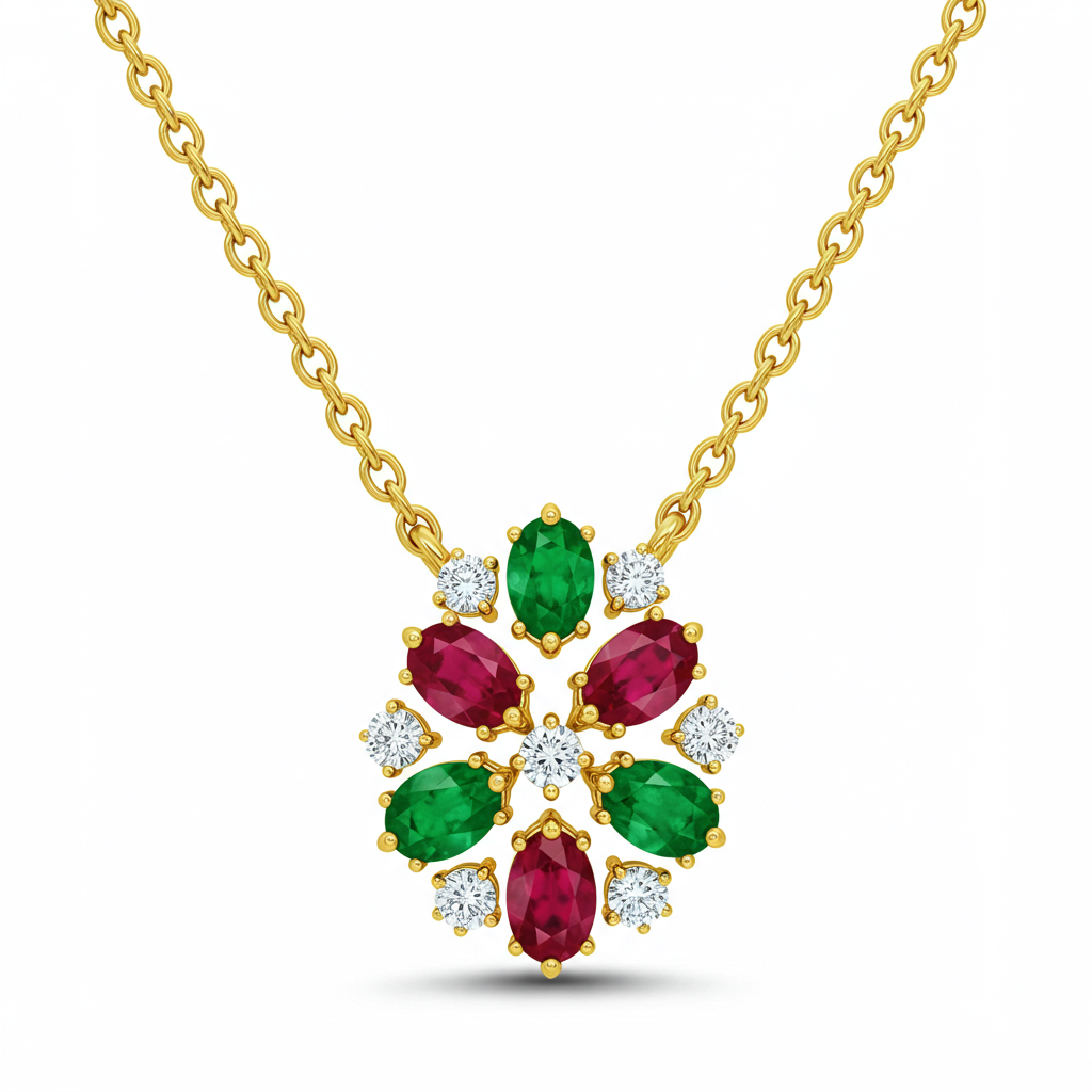 This exquisite 18KT yellow gold necklace captures the vibrant beauty of nature through a striking arrangement of rubies and emeralds. Centered around a meticulously crafted cluster, the design is further enhanced by brilliant VVS diamonds that add unparalleled sparkle. The rich red of the rubies perfectly complements the deep green of the emeralds, creating a breathtaking contrast. Suspended from a delicate yet sturdy gold chain, this piece is an embodiment of timeless elegance and masterful craftsmanship.