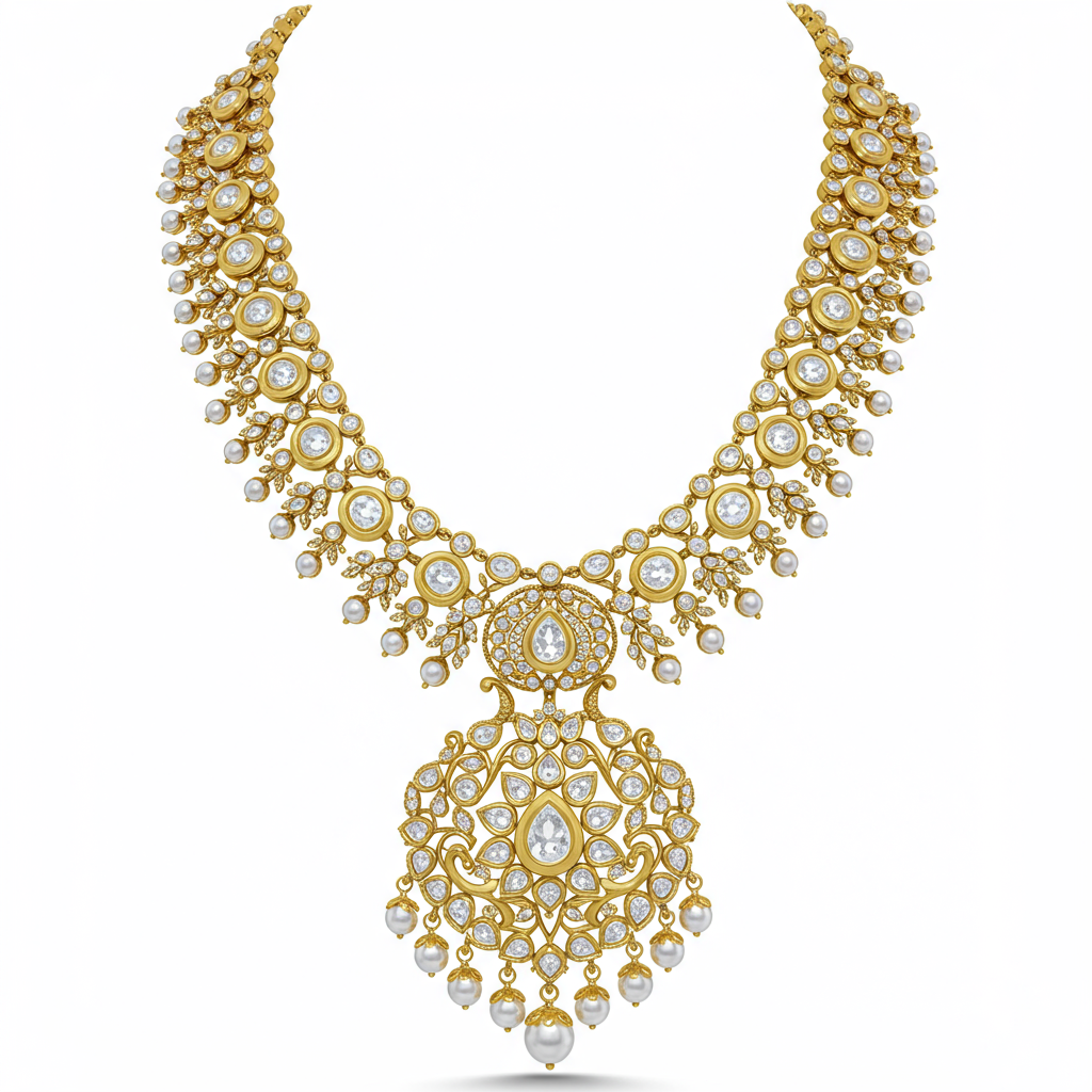 A magnificent long kundan necklace, meticulously handcrafted to capture the grandeur of traditional Indian jewelry artistry. This exquisite piece features large, foil-backed Kundan stones set in gleaming 18KT yellow gold, creating a stunning vintage aesthetic. The elaborate design incorporates delicate diamond accents that enhance the brilliance and texture of the overall structure. It is the perfect statement piece for high-end ceremonial occasions, promising regal elegance and timeless beauty.