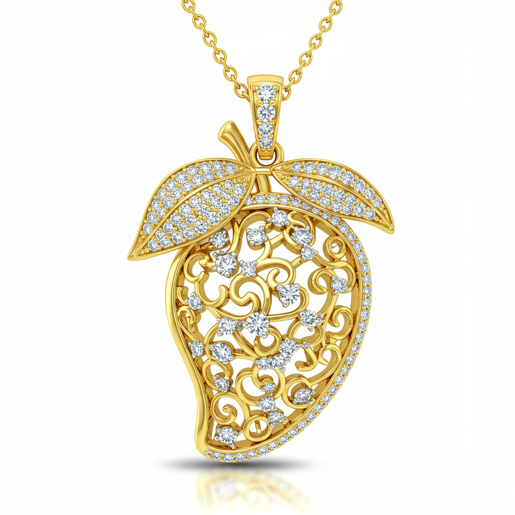 The Mango Design Necklace captures the essence of tropical elegance with its sophisticated, curvaceous silhouette. Crafted meticulously in radiant 18KT yellow gold, the pendant showcases a magnificent cluster setting that enhances its organic form. This exquisite piece is fully paved with exceptional VVS diamonds, reflecting light brilliantly from every angle. It is a stunning statement accessory designed to be cherished as a timeless heirloom.