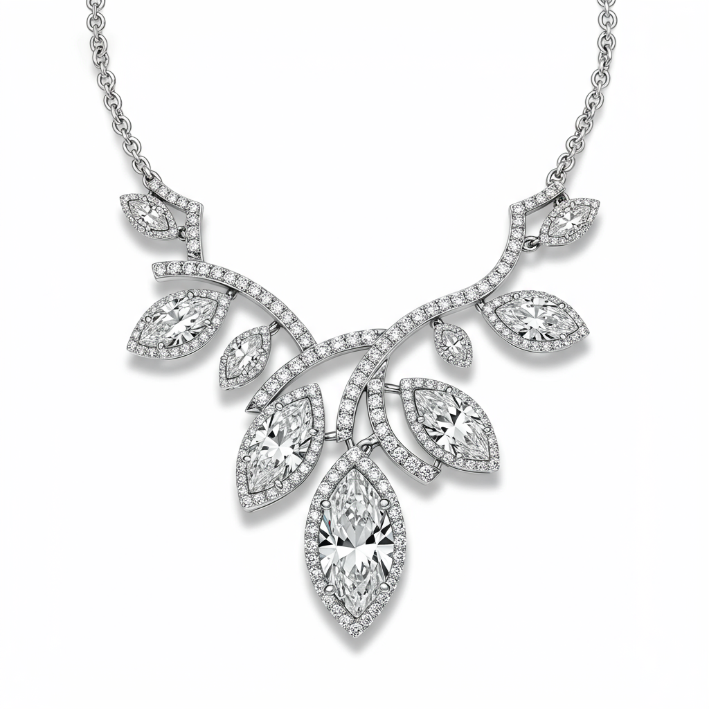 This extraordinary statement necklace epitomizes high jewelry design, engineered for maximum brilliance and drape. Crafted in lustrous 18KT white gold, the design features complex articulation, allowing the piece to sit perfectly against the collarbone. It is lavishly set with over seven carats of pristine VVS diamonds, creating a cascade of light with every movement. This magnificent piece is the ultimate accessory for the most exclusive black-tie events, assuring an unforgettable entrance.