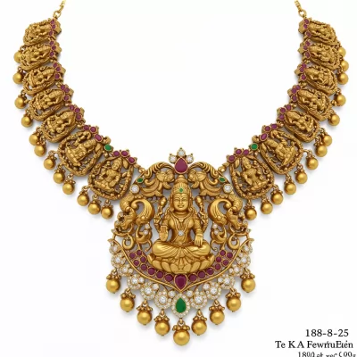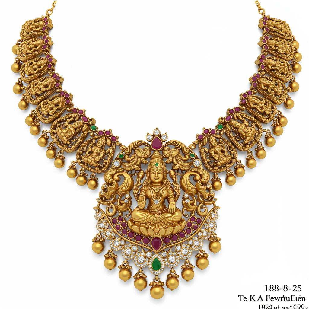 This magnificent Temple Jewellery Necklace captures the rich heritage and divine artistry of South Indian traditions. Crafted meticulously in 18KT yellow gold, the design features intricate filigree work and stylized motifs of goddesses and deities, embodying spiritual grace. It is lavishly set with high-quality rubies and emeralds, alongside brilliant VVS diamonds, enhancing its regal stature. This statement piece is perfect for grand celebrations, offering an unparalleled blend of cultural legacy and luxurious craftsmanship.
