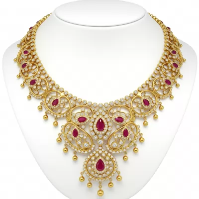 This magnificent traditional necklace for women is a masterpiece of heirloom jewelry, crafted meticulously in rich 18KT yellow gold. It features an ornate central motif inspired by ancient Indian designs, highlighted by brilliant-cut diamonds set in precise pavé and bezel settings. The fluid design drapes elegantly, offering a regal and timeless appearance perfect for significant occasions and cultural celebrations. This piece captures the essence of classic artistry while maintaining exceptional modern brilliance.