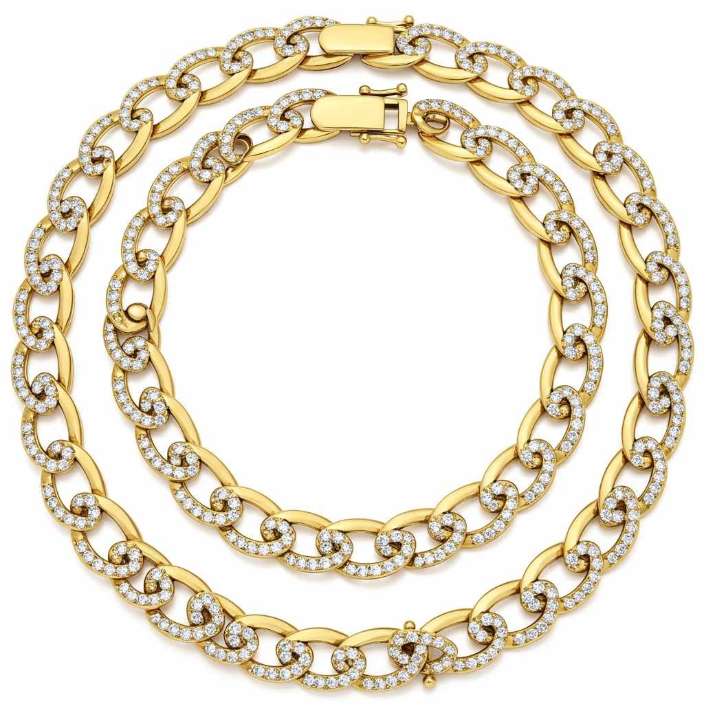 The "gold necklace artificial" is a masterpiece of modern luxury, meticulously crafted in radiant 18KT yellow gold. This striking piece features an intricate link design accented by brilliant-cut diamonds, offering unparalleled shimmer. Each diamond is selected for its exceptional VVS clarity and G-H color, ensuring breathtaking sparkle across the entire length. The result is a statement necklace that embodies sophistication and timeless elegance, perfect for elevating any formal or casual attire. It is designed to be a centerpiece of any high-end jewelry collection.