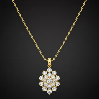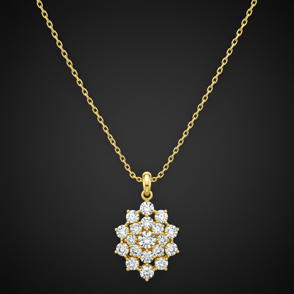 The Rani Gold Necklace is a masterpiece of royal heritage, featuring a meticulously crafted cluster design that evokes the grandeur of Indian royalty. Set in radiant 18KT yellow gold, this piece showcases 2.15 carats of brilliant VVS diamonds, expertly arranged to maximize sparkle and dimension. Its central motif is suspended from a delicate yet durable chain, ensuring the perfect drape against the décolletage. This heirloom-quality necklace is designed for the modern woman who cherishes timeless elegance and unparalleled craftsmanship.