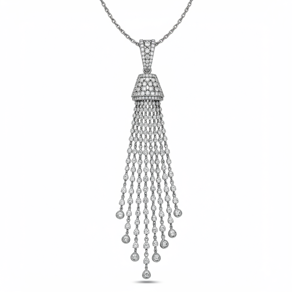 The Tassel Necklace is a masterpiece of fluid movement and brilliant sparkle, capturing light with every step. Crafted in luxurious 18KT white gold, the design features an elongated bail leading to multiple cascading strands of expertly set round diamonds, creating an elegant, shimmering tassel effect. This sophisticated piece drapes beautifully along the décolletage, offering a dramatic yet refined statement. It serves as the ultimate accessory for black-tie events or adding a touch of glamour to elevated evening wear.