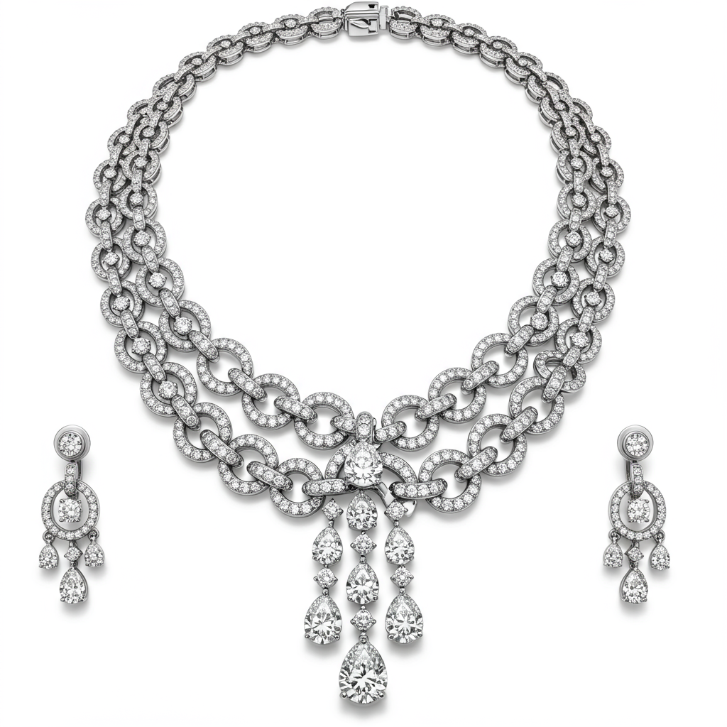This extraordinary wedding necklace set, crafted in radiant 18KT white gold, is designed to epitomize bridal grandeur. The collection features a flexible necklace and coordinating drop earrings, both entirely blanketed in brilliant-cut diamonds. Each piece reflects flawless craftsmanship and eternal elegance, making it an undeniable heirloom. This set is the ultimate statement of luxury and love for your most significant day.