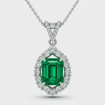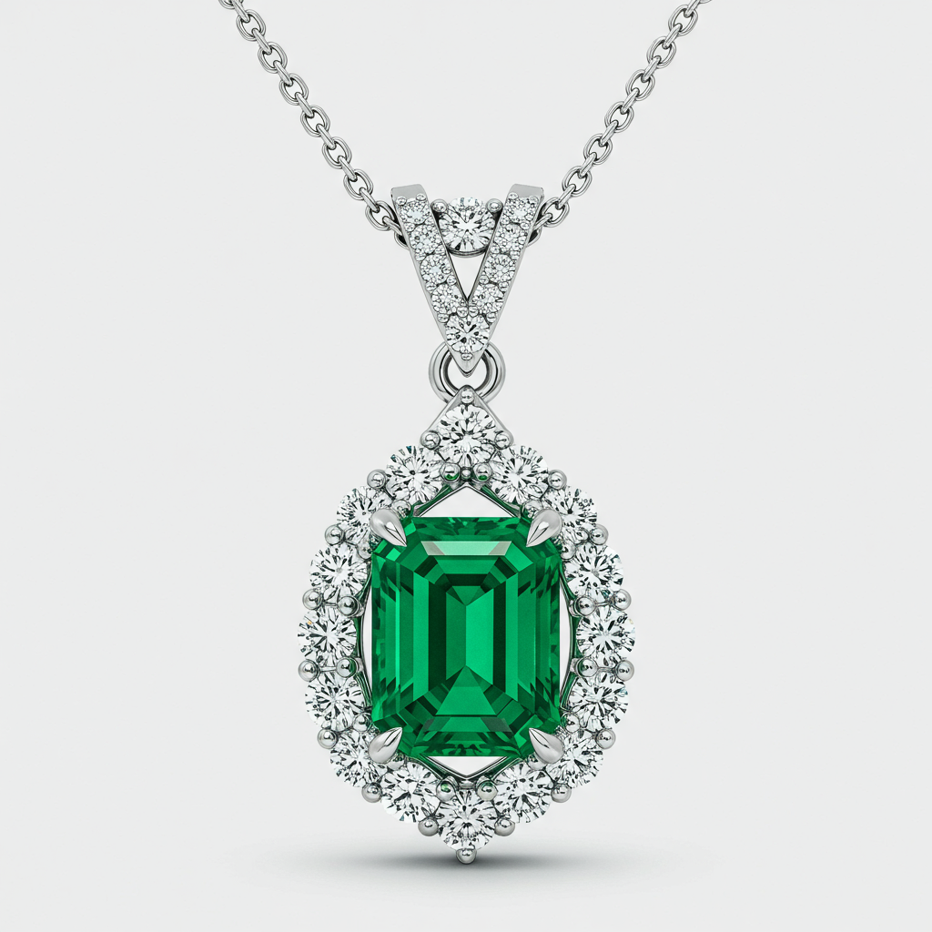 This stunning emerald green necklace features a central, captivating emerald-cut gemstone suspended from a delicate 18KT white gold chain. The vibrant green stone is meticulously encircled by a halo of brilliant-cut VVS diamonds, creating an intense, luxurious contrast. Designed for timeless elegance, this piece is an iconic statement accessory suitable for the most formal occasions. Its exceptional craftsmanship ensures enduring brilliance and sophisticated allure.