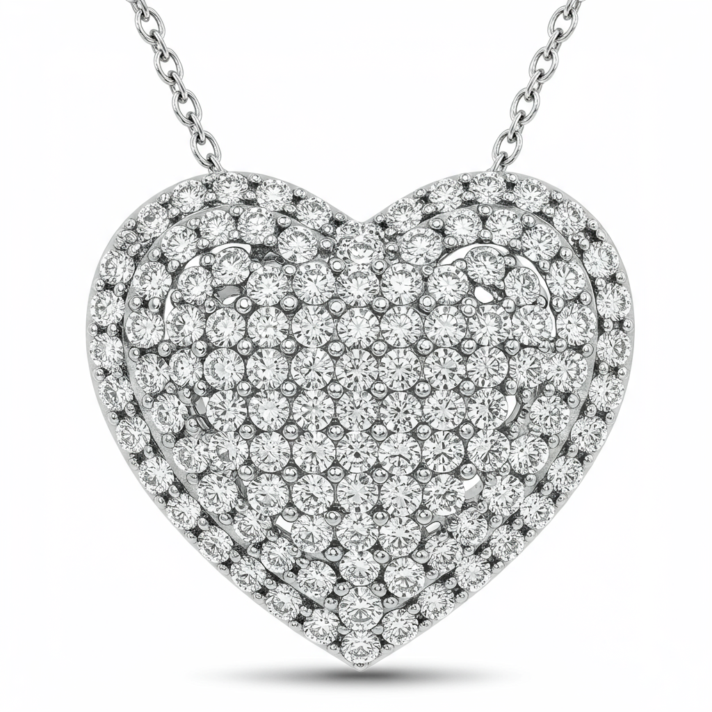 This exquisite heart shaped necklace captures eternal romance in radiant 18KT white gold. The delicate pendant features a brilliant pave setting, meticulously encrusted with VVS clarity diamonds that sparkle intensely. Suspended from a graceful adjustable chain, this piece serves as a timeless emblem of love and devotion. It is the perfect luxurious gift, ideal for celebrating anniversaries or special milestones, offering everyday elegance and lasting quality.