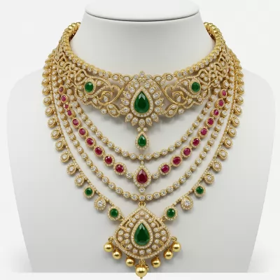 The 'Lehenga Empress' necklace is a majestic tribute to traditional Indian bridal artistry, designed to perfectly complement voluminous lehengas. Crafted in radiant 18KT yellow gold, this elaborate choker features cascading layers adorned with brilliant VVS diamonds. Interspersed among the sparkle are vibrant clusters of natural emeralds and rubies, adding a rich, regal contrast. This statement piece ensures the wearer commands attention on her most significant occasion, embodying unmatched grace and splendor.